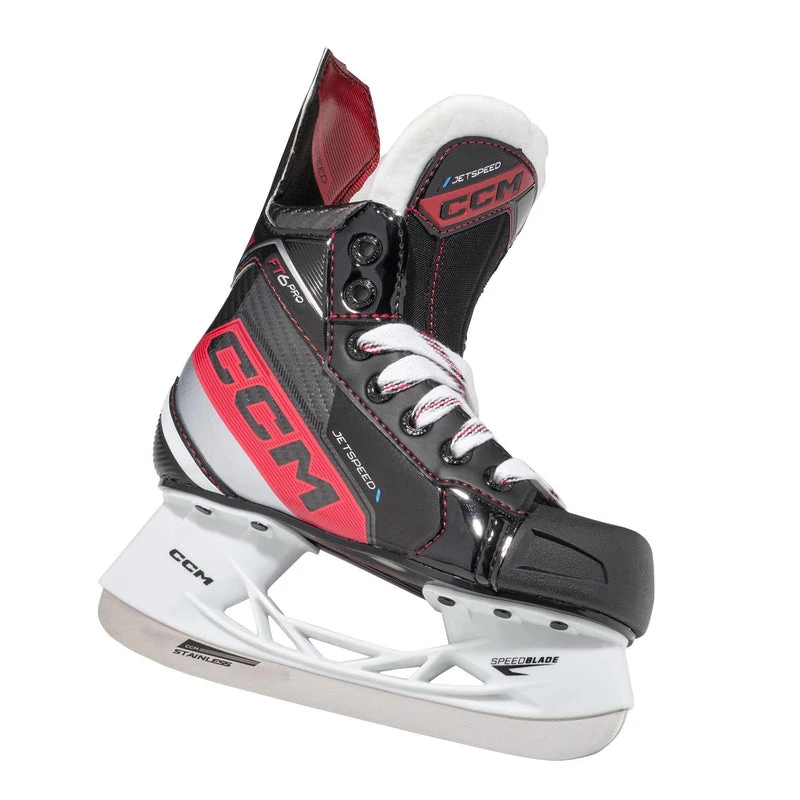The new and improved one-piece boot speed is all about performance and acceleration, now featuring game ready fit for the ultimate anatomical connection from your foot to your skate, maximizing comfort and force transmission The PowerFlex tendon provides more range of motion and increased extension on your skating strides for faster foot speed The ADPT comfort tongue features FlexMotion lace-bite technology to enhance your forward flexion and Metatomic TriTech construction for optimal fit and comfort Equipped with best-in-class step BlackSteel, these blades are carbon-coated for better edge life and phenomenal gliding ability to make you skate faster than ever The new enhanced dial integrated into the XS holder enables quicker and easier blade exchanges, even in ice and snow Throw in enhanced ankle and liner padding, and the JetSpeed FT6 Pro skates will have you looking good, feeling good, and playing good