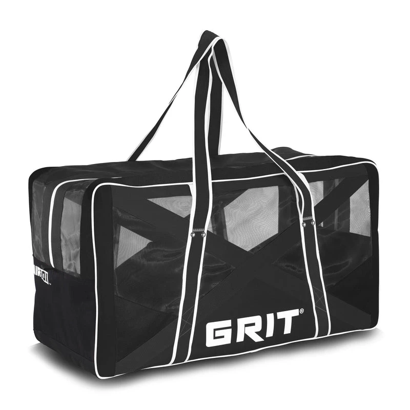 The GRIT Airbox is a traditionally styled hockey bag that breathes! The unique crossover construction involves sewing polyester webbing over nylon mesh to create a bag that is very strong and vents in all directions Inside the bag there are dividers and pockets that provide organization for gear and accessories Included in the bag is a cooler sleeve for beverages